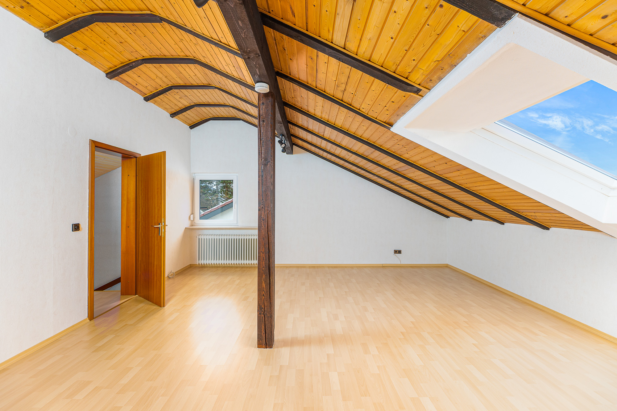 Das Dachgeschoss verfügt über ein großzügiges und helles Dachstudio, das in zwei Räume unterteilt wurde und sich vielseitig nutzen lässt, beispielsweise als Arbeits-, Gäste-, Spiel- oder Sportzimmer. Ergänzt wird diese Etage durch ein älteres Gäste-WC, welches renovierungsbedürftig ist. Die verbauten VELUX-Dachflächenfenster stammen aus den Jahren 1998 & 2006 und können abgedunkelt werden. Das Dach selbst wurde im Jahr 2010 umfassend renoviert, einschließlich der Dacheindeckung sowie der Dämmung. Seit 2011 ist das Dachgeschoss mit einem Laminatboden ausgestattet.