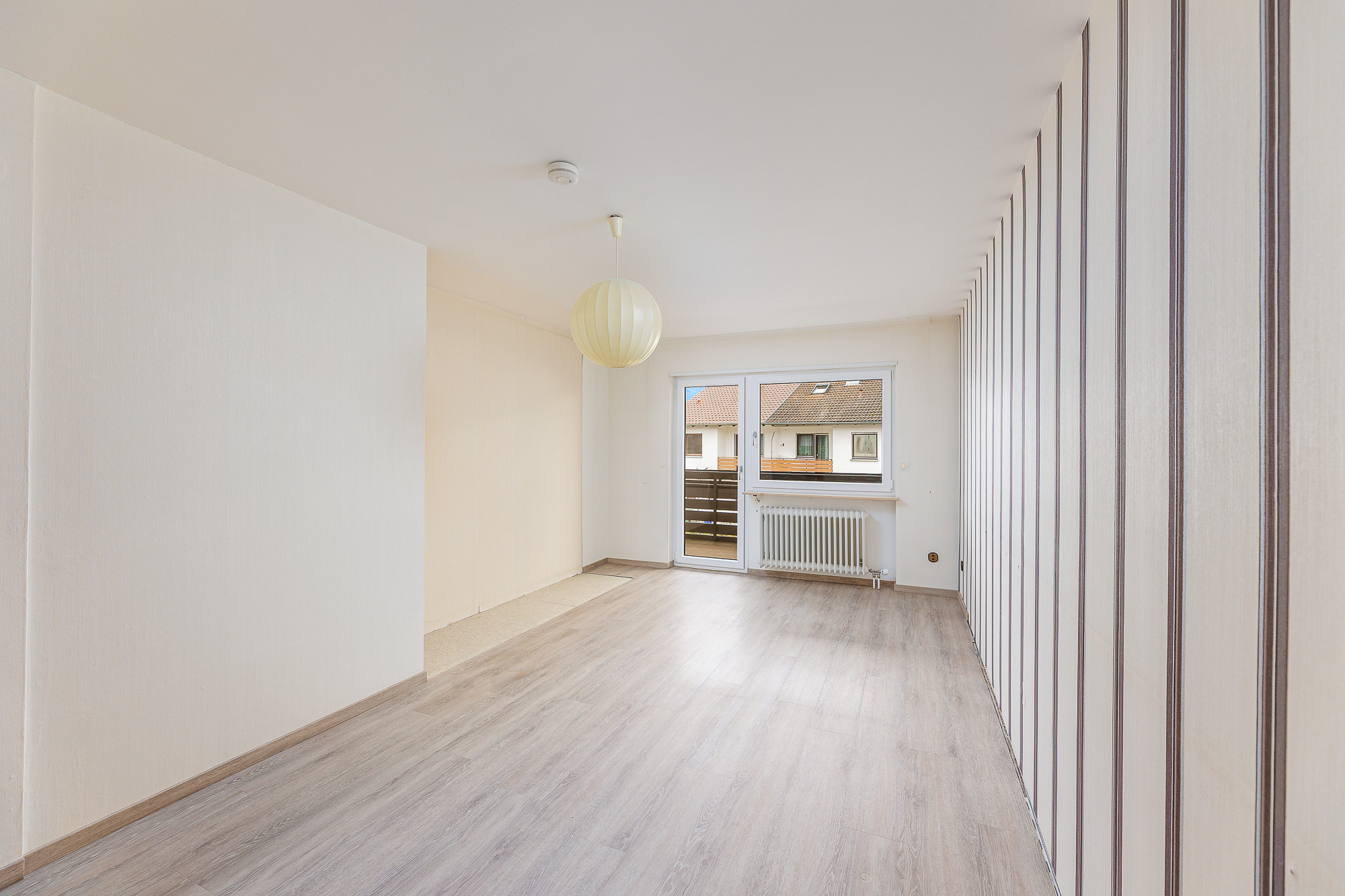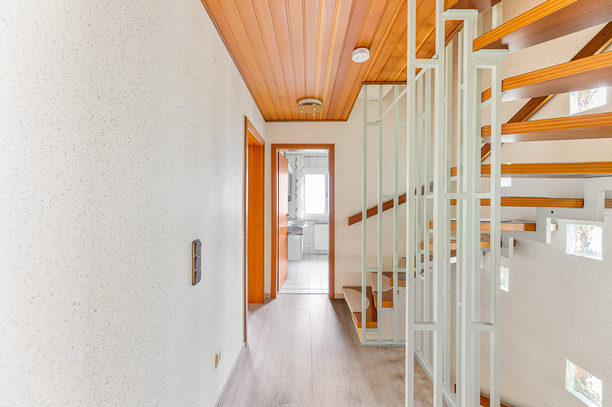Vom Flur aus führt eine offene Echtholztreppe in das erste Obergeschoss sowie weiter ins Dachgeschoss. Im Obergeschoss befinden sich drei Schlafzimmer, die flexibel als Kinderzimmer, Gästezimmer oder Homeoffice genutzt werden können, sowie ein großzügiges Tageslichtbad mit neuer bodentiefer Dusche. Zusätzlich verfügt das Obergeschoss über zwei Balkone auf beiden Seiten des Hauses.