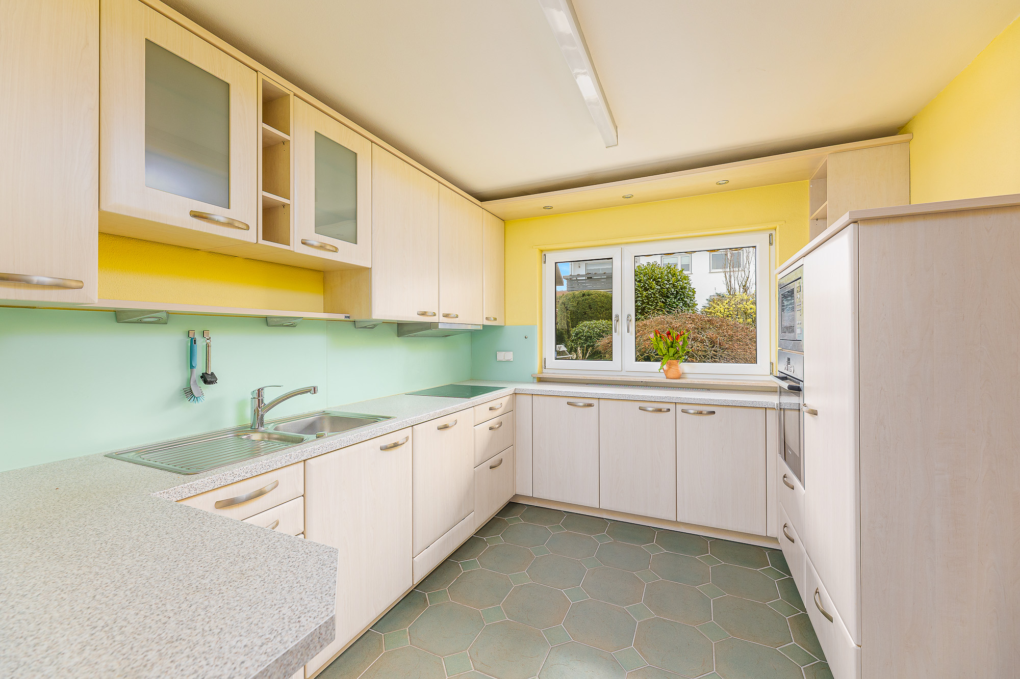 Im Erdgeschoss gelangt man über einen kleinen Flur in den großzügigen Wohn- und Essbereich, in die helle Einbauküche aus dem Jahr 2007 sowie in das Tageslicht-Gäste-WC und auf die nach Osten gerichtete Terrasse. Sämtliche Fenster und Türen im Erdgeschoss sind abschließbar; die Terrassentüren sind zusätzlich mit Insektenschutzgittern ausgestattet, ebenso die Küche. Die Einbauküche mit Blick in den Garten und einer Schiebetür zum Essbereich präsentiert sich als echtes Raumwunder. Sie ist überwiegend mit hochwertigen Bosch-Einbaugeräten ausgestattet; lediglich die Spülmaschine wurde durch ein Gerät der Firma Siemens ersetzt. Helle, beige Fronten und silbrig glänzende Armaturen verleihen der Küche eine zeitlose Optik. Zudem bietet sie großzügigen Stauraum für Küchenutensilien, zahlreiche Schubladen sowie eine bereits integrierte Mikrowelle. Wohn- und Essbereich sind zu einem großzügigen Raum vereint, von dem aus man direkt die überdachte Terrasse nach Westen betreten kann – ideal für gemütliche Abendstunden im Freien.